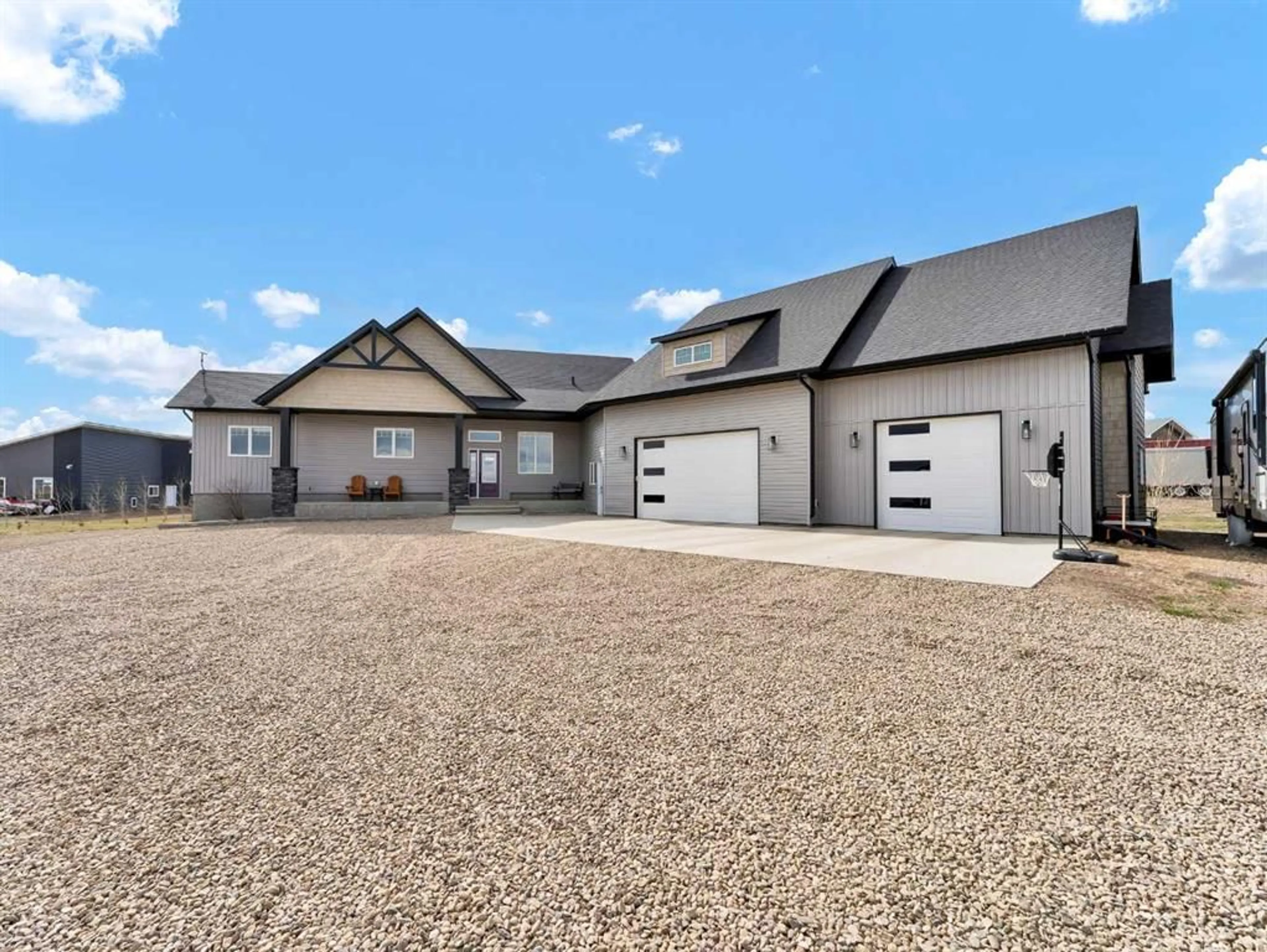 Welcome to the kind of lakefront lifestyle most people only dream about. Tucked along the peaceful shores of Klaudt’s Dam and only 15 minutes from town, this 2.17-acre property isn’t just a home — it’s a place where families grow, gather, and make memories all year long. From summer mornings spent on the water to winter evenings skating under prairie skies, this is a lifestyle that invites you to slow down, breathe deeper, and truly enjoy where you live. At the center of it all is a beautiful custom bungalow that blends thoughtful design with timeless style. The main floor welcomes you with an open-concept layout that frames those incredible lake views from every angle. The kitchen is built for connection — a large island for kids to perch at, quartz countertops, high-end appliances, and plenty of space to cook, gather, and celebrate!! Vaulted ceilings and a cozy fireplace make the living room the heart of the home, whether you’re hosting friends or winding down after a day on the lake. Step out onto the covered deck to take in the calm water, the huge yard, and the simple joy of having nature as your backdrop. The primary suite feels like a private retreat with its own lake views, a spa-inspired ensuite, and a clever pass-through walk-in closet connected directly to the laundry room — the kind of everyday convenience you won’t know how you lived without. Two more bedrooms and a full bath round out the main floor. The fully finished lower level adds even more room for living and playing. A spacious family area, rec room, and a flexible space perfect for a gym, playroom, home office, or hobby room make it easy for everyone to have their own corner of the home. Two additional bedrooms (the flex space could become a 6th if needed) and another full bath create the ideal setup for kids, guests, or multigenerational living. And then there’s the garage — oversized, heated, a dog run, hot & cold water, and built with both practicality and possibility in mind. Park multiple vehicles, set up a workshop, or store all the gear that comes with true acreage and lakefront living. With city water from West Side Water Co-Op and pressurized for irrigation, caring for the property is effortless. The expansive yard is ready for family barbecues, outdoor adventures, and long, relaxed evenings under the open prairie sky. And with the lake just steps away, every season brings something to look forward to — swimming, fishing, paddleboarding, skating, or simply sipping your morning coffee by the water. Whether you’re searching for a full-time family home or a place to escape and reconnect, this lakefront acreage in this special community offers something rare: luxury that feels liveable, nature at your doorstep, and a lifestyle designed for connection, adventure, and joy. This home is in immaculate condition; all that is to do is move in and start enjoying!