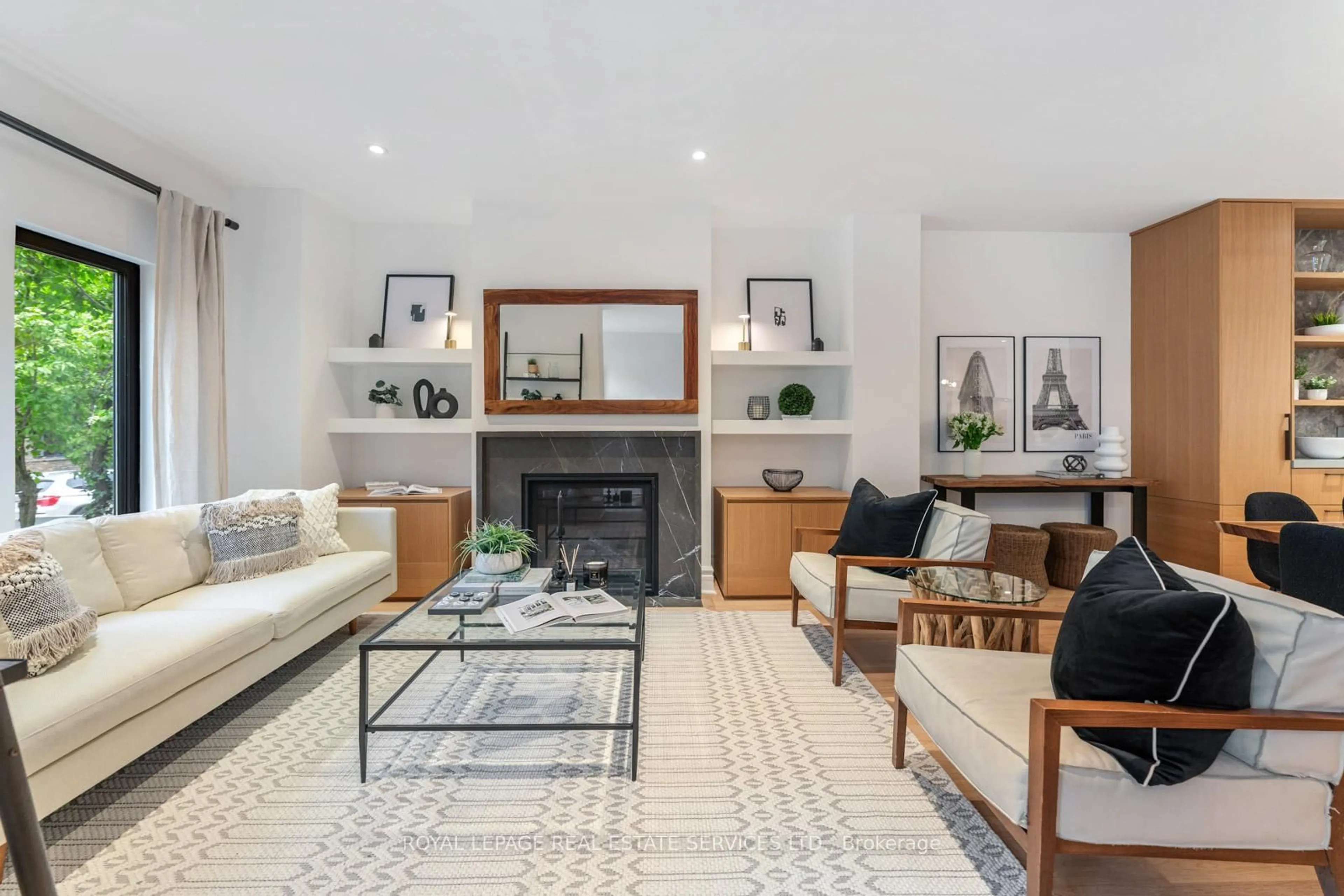 Welcome to this designer-renovated home in an exclusive enclave of Roncesvalles. Surrounded by historic architecture, this Victorian-inspired residence stands out. Built in 1999 and exquisitely reimagined in 2020, this 2,651 sq ft detached home flawlessly blending classic character with contemporary luxury. The main floor makes a striking first impression with its open, airy layout and rich textures. The living room is centred around a gas fireplace with black marble surround, flanked by custom floating shelves and built-in cabinetry. The dining area seats eight easily; perfect for memorable evenings with friends and family. The chef's kitchen is a design-forward dream, featuring Caesarstone counters, sleek two-tone cabinetry, marble backsplash, and generous centre island with seating for 4. High-performance appliances include a Jenn-Air gas range, paneled refrigerator, BOSCH dishwasher, microwave drawer, and bar fridge. A coffee station, prep sink, and under-cab. lighting add function and flair. French doors open onto a lush, landscaped backyard/patio, creating effortless indoor-outdoor entertaining. A powder room and custom entryway bench with coat storage complete this level. Upstairs, discover 4 sun-filled bedrooms and 2 full bathrooms. The top floor is an extraordinary primary suite with soaring vaulted ceilings, skylights, closets, and a luxurious 4-piece ensuite with double vanity. Step out to your expansive rooftop terrace with stunning skyline views. The bsmt features high ceilings, spacious rec room, large laundry area, 4-piece bath, and cantina/cellar storage at both ends. Easy potential for a sep. suite or creative use. The fully fenced backyard connects to a private, kid-friendly street; no through traffic, just a quiet space to play and unwind. Detached garage parking and potential for a second space steps from the beloved cafes, boutiques, parks, and transit of Roncesvalles Village. its a lifestyle statement; rare, refined, and completely turnkey.