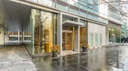 Exceptional Four Seasons Residence. Situated in prime Yorkville, living here is unparalleled. Residents enjoy full hotel-style amenities including concierge services, valet parking, and membership to the exclusive health club. Located steps away from superb dining and shopping options, this suite offers approximately 1600 square feet of space flooded with natural light through floor-to-ceiling windows facing west and north. The spacious open-concept living and dining area extends to a 20-foot covered balcony, ideal for enjoying cocktails while watching the sunset. The contemporary kitchen features a substantial stone-topped breakfast bar providing ample seating for morning coffee. There are two generously sized bedrooms, each with marble spa-like ensuite baths; the primary bedroom includes a soaking tub, large glass shower, and double sinks. The foyer boasts marble flooring, a double closet, and a powder room. Exceptional closet space supplemented by additional customized built-in cabinets. TWO parking spots included, a rare offering.